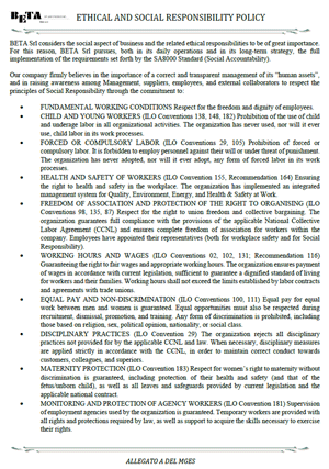 Beta s.r.l. nel 2023 ha ottenuto la certificazione ISO 9001: 2015 per i Sistemi di Gestione della Qualità, nel 2024 la certificazione ISO 14001: 2015 per i Sistemi di Gestione Ambientale e nel 2025 la certificazione ISO 50001:2018 per il Sistema di Gestione dell’Energia. E in un’ottica di miglioramento continuo è in corso l’integrazione con le seguenti normative: ISO 45001 e SA 8000.
